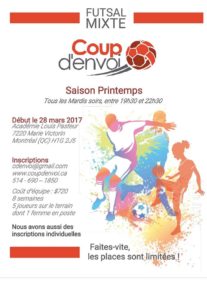 25 mars 201725 mars 2017 Saison Printemps Futsal Mixte Saison Printemps Inscriptions ouvertes 8 semaines Réservez votre place.